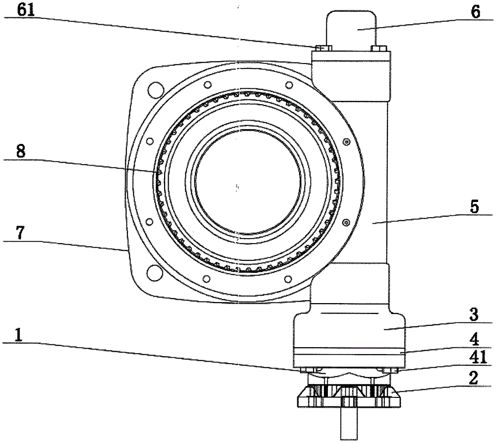 所述星型齒輪下箱體1、星型齒輪上箱體3、連接箱體4通過數個第一緊固螺栓41連接。數個第一緊固螺栓41的設置使得星型齒輪下箱體1、星型齒輪上箱體3、連接箱體4連接緊固,便于裝卸,方便對于內部組件進行更換維護,減少裝卸強度,提高效率。
