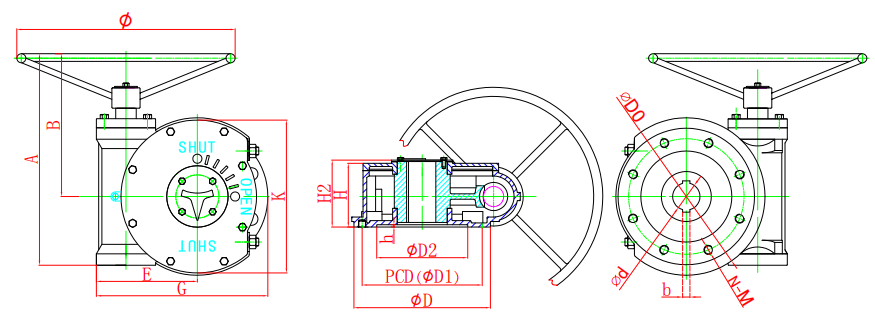 該系列蝸輪箱適用環境廣、功能全面、形式多樣(有手輪式、手輪帶鎖式、鏈輪式等),產品共有9種型號。